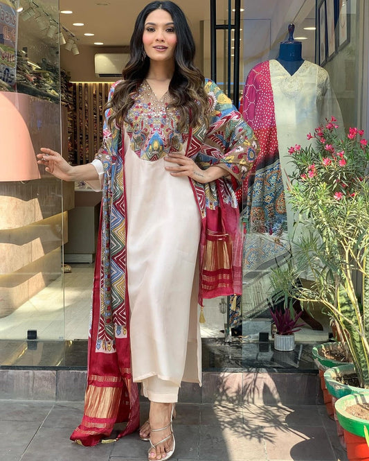Launching Summer Cool, Comfortable And Attractive Softest Muslin Suit Set Which Is Beautifully Decorated With Hand Embroidery And Thread Work. It Is Paired With Matching Pants And Dupatta(WARED17)
