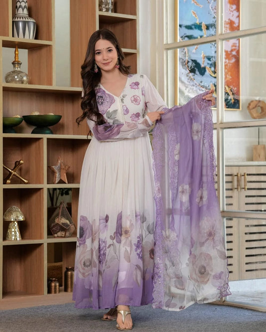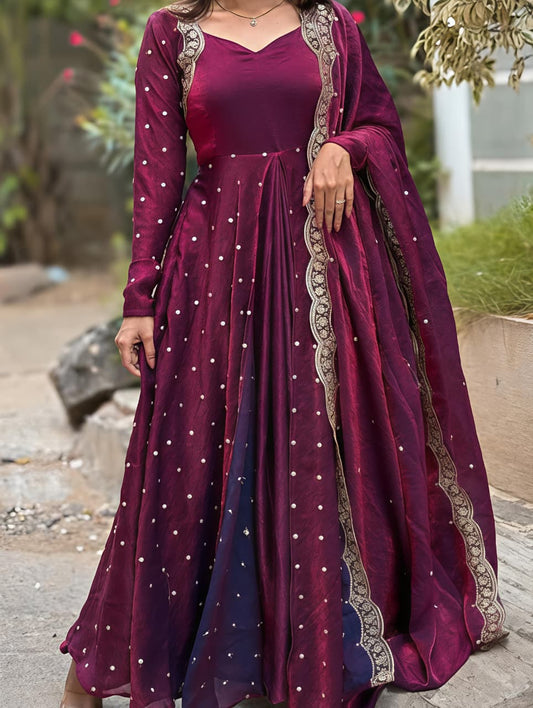 Elegant Design Premium Roman Silk Anrakali Suit set With Nazmin Dupatta And Dori and Kodi on sleeve for adjustment Embroidery work on all Over kurti and Sleeve. (RRRD12)
