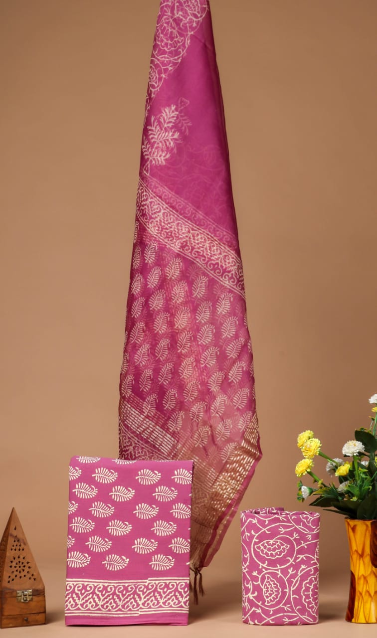 Shop unstitched cotton suit with organza dupatta. Hand block printing is a centuries-old Indian art form that uses a hand-carved teak woodblock to print garments. These garments are purely a work of artisans and unsymmetric in nature.
