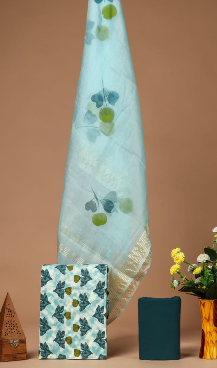 Shop unstitched cotton suit with organza dupatta. Hand block printing is a centuries-old Indian art form that uses a hand-carved teak woodblock to print garments. These garments are purely a work of artisans and unsymmetric in nature.