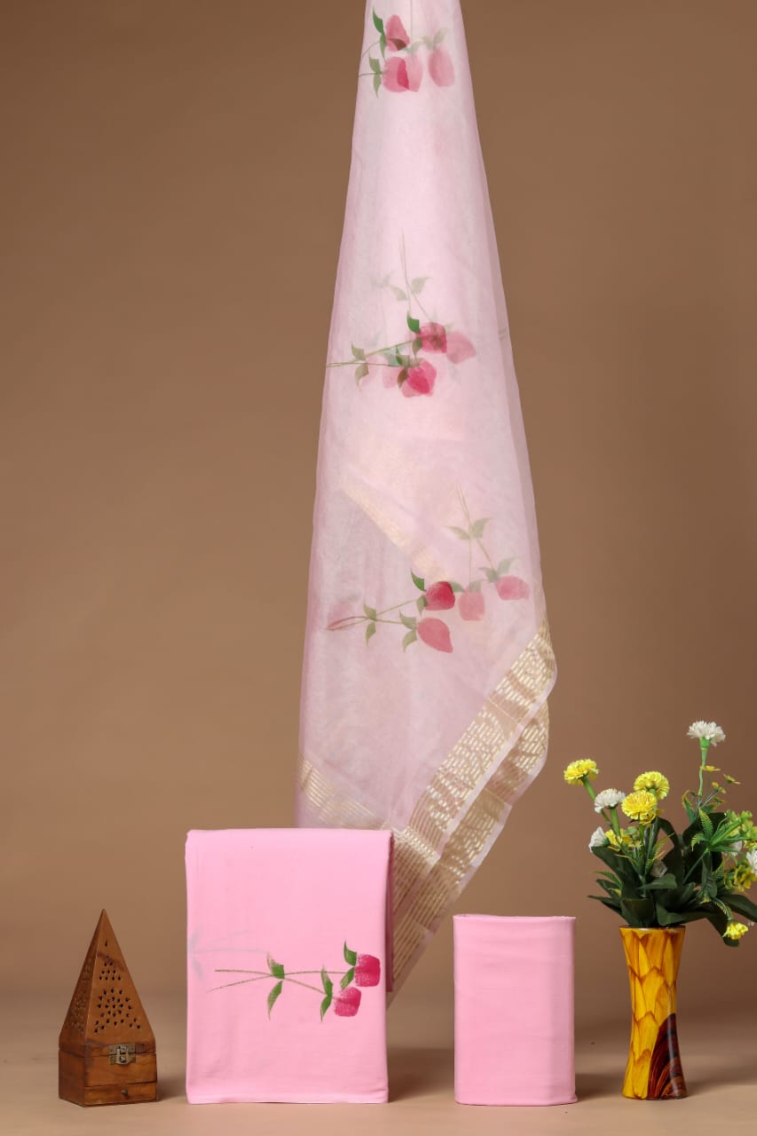 Shop unstitched cotton suit with organza dupatta. Hand block printing is a centuries-old Indian art form that uses a hand-carved teak woodblock to print garments. These garments are purely a work of artisans and unsymmetric in nature.