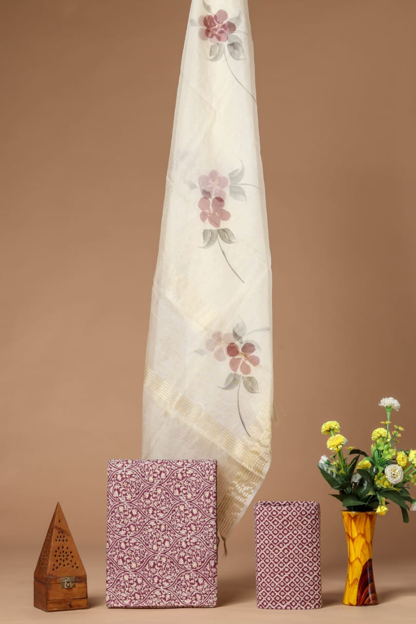 Shop unstitched cotton suit with organza dupatta. Hand block printing is a centuries-old Indian art form that uses a hand-carved teak woodblock to print garments. These garments are purely a work of artisans and unsymmetric in nature.