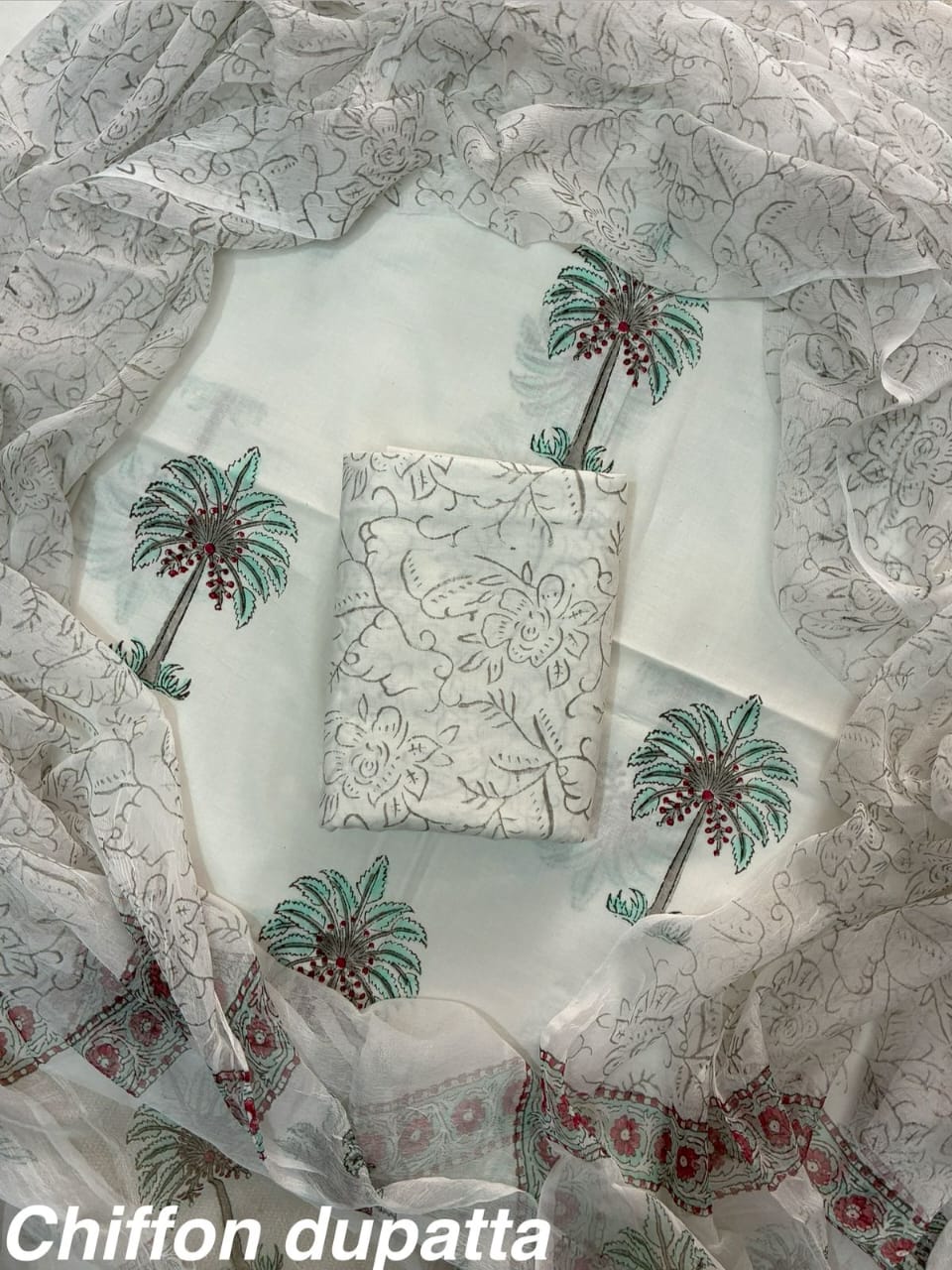 ELEGANT HAND BLOCK PRINT COTTON SUIT SET WITH CHIFFON DUPATTA(WACFCOTMU47)