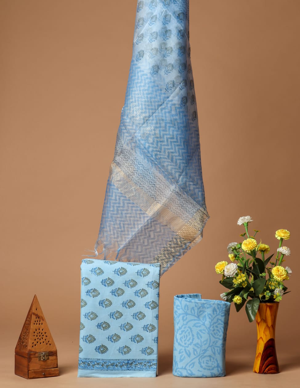 Elegant Hand Block Print Cotton Suit Set with Organza Dupatta (SWORG02)