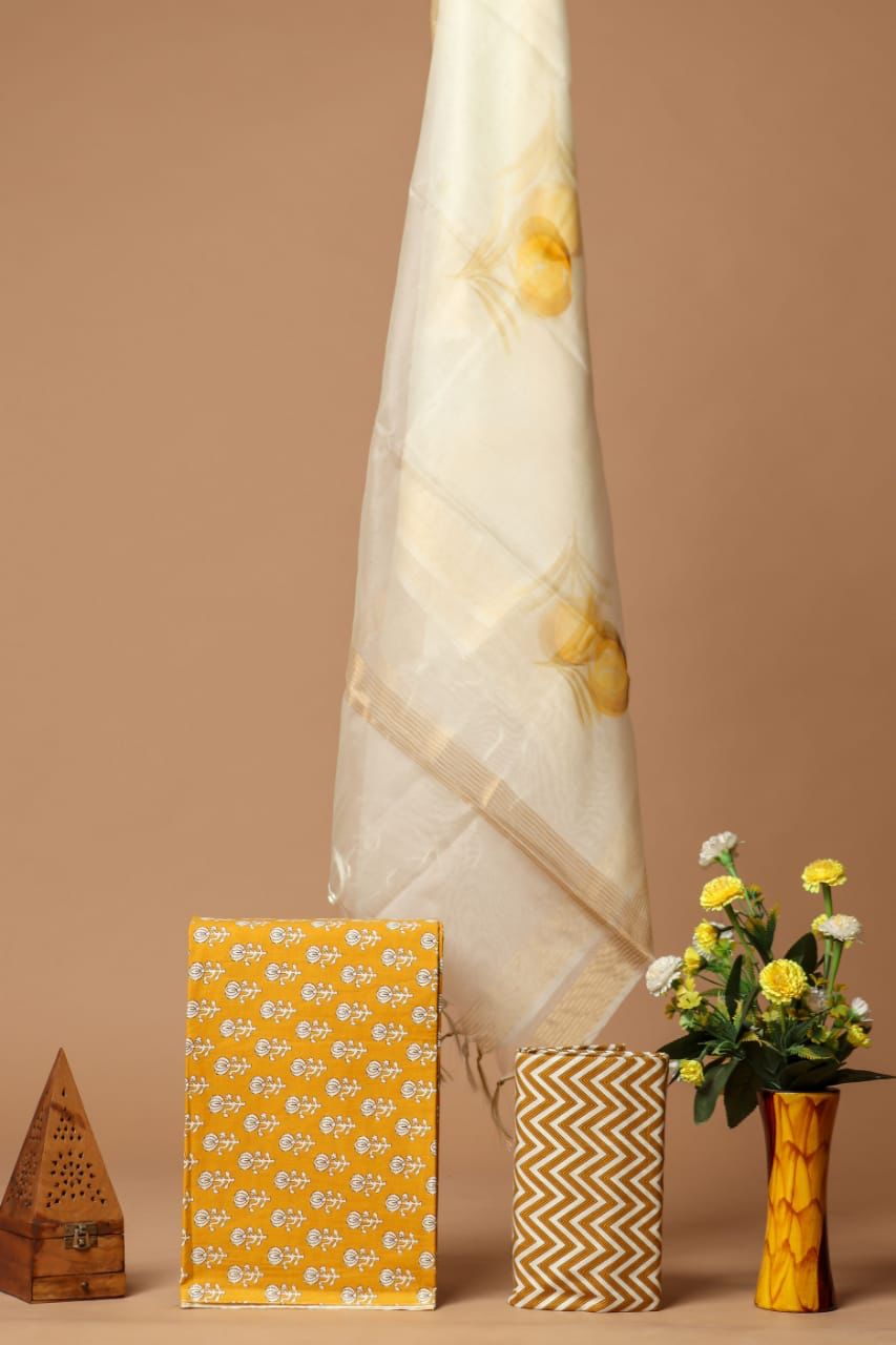 Shop unstitched cotton suit with organza dupatta. Hand block printing is a centuries-old Indian art form that uses a hand-carved teak woodblock to print garments. These garments are purely a work of artisans and unsymmetric in nature.