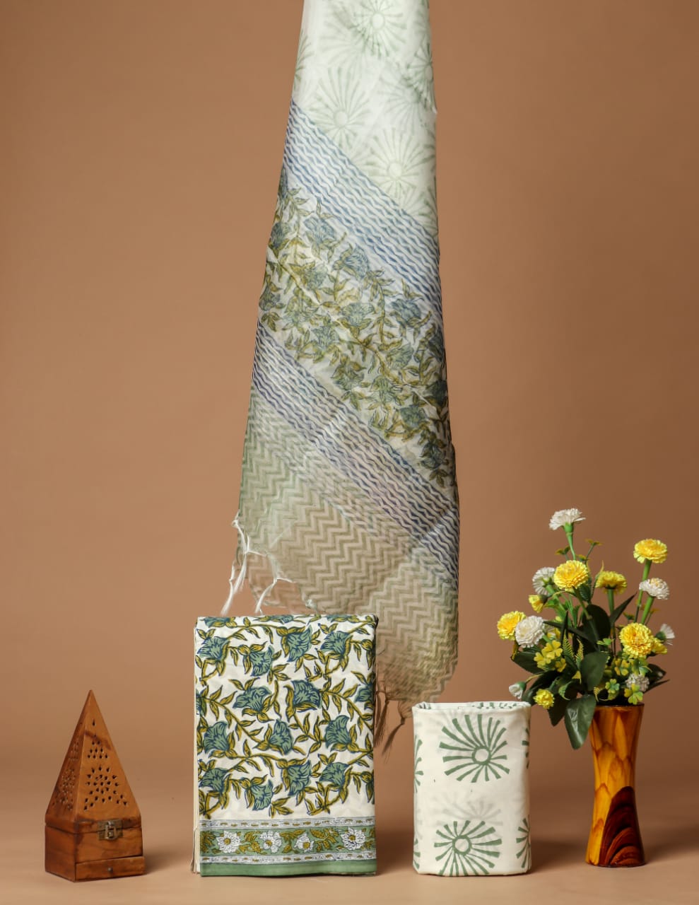 Shop unstitched cotton suit with organza dupatta. Hand block printing is a centuries-old Indian art form that uses a hand-carved teak woodblock to print garments. These garments are purely a work of artisans and unsymmetric in nature.