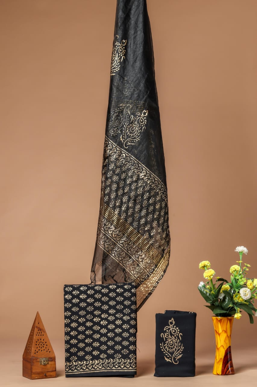 Shop unstitched cotton suit with organza dupatta. Hand block printing is a centuries-old Indian art form that uses a hand-carved teak woodblock to print garments. These garments are purely a work of artisans and unsymmetric in nature.