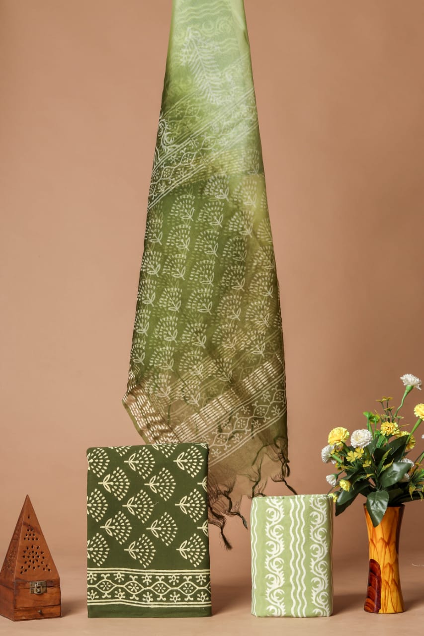 Shop unstitched cotton suit with organza dupatta. Hand block printing is a centuries-old Indian art form that uses a hand-carved teak woodblock to print garments. These garments are purely a work of artisans and unsymmetric in nature.