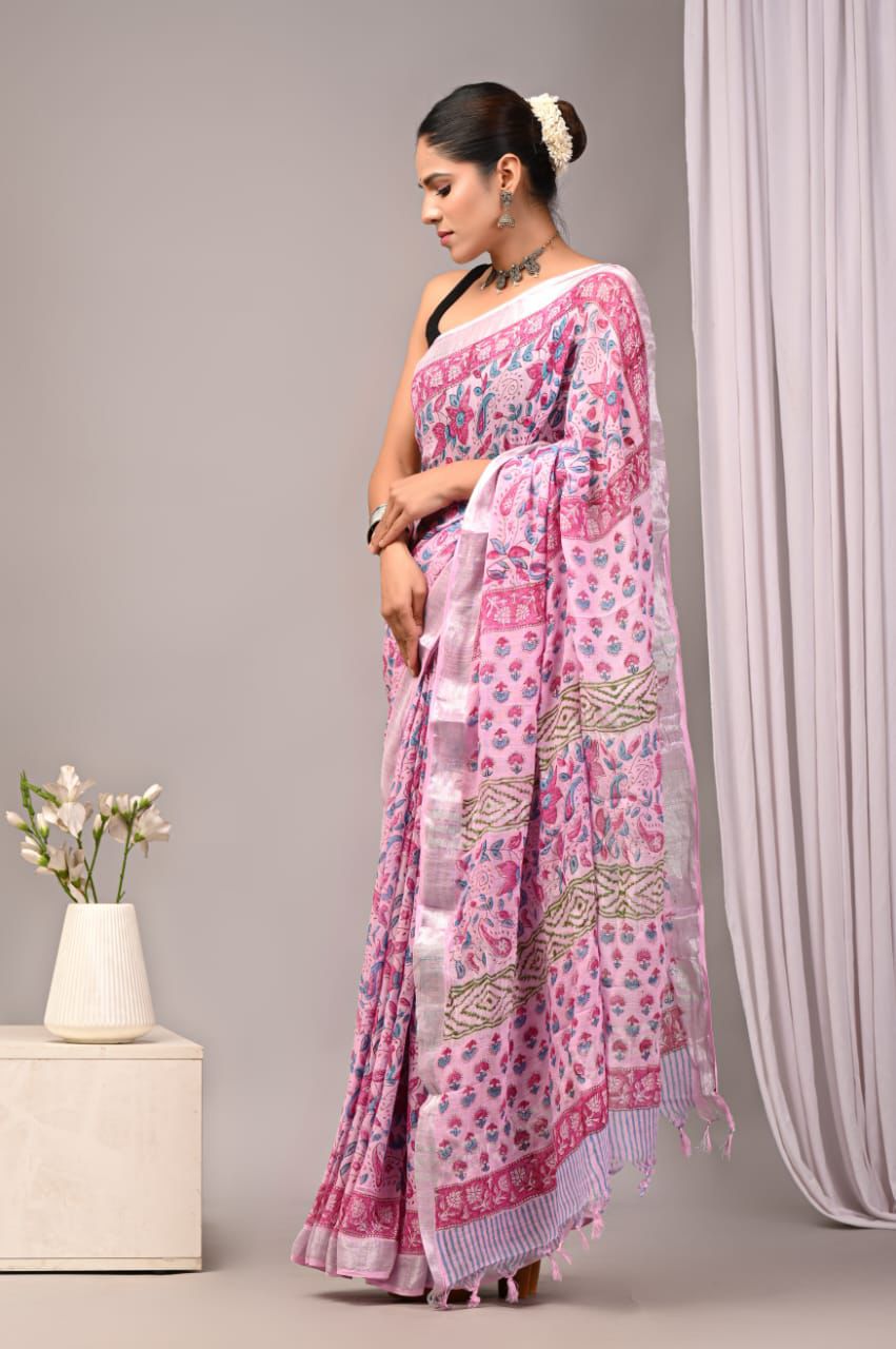 Hand Block Printed Linen Saree With Unstitched Blouse (SWSRLIL21)