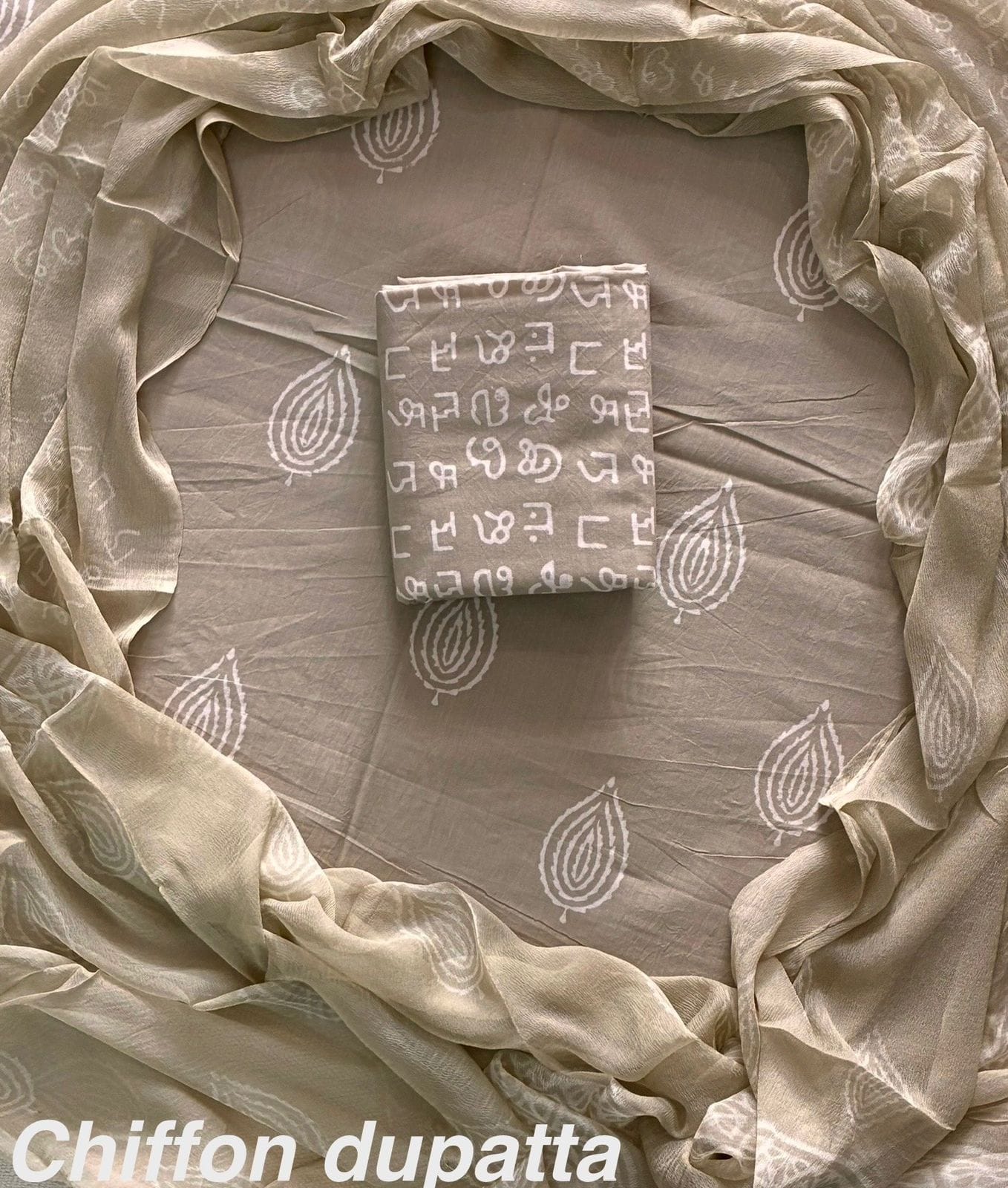 Hand Block Print Cotton Suit Set with Chiffon Dupatta(WACFCOTMU30)