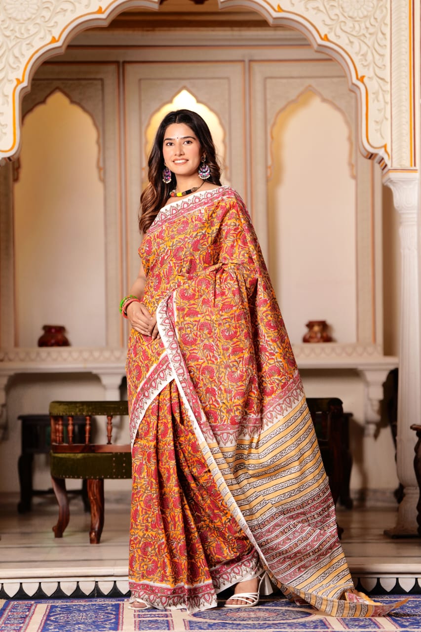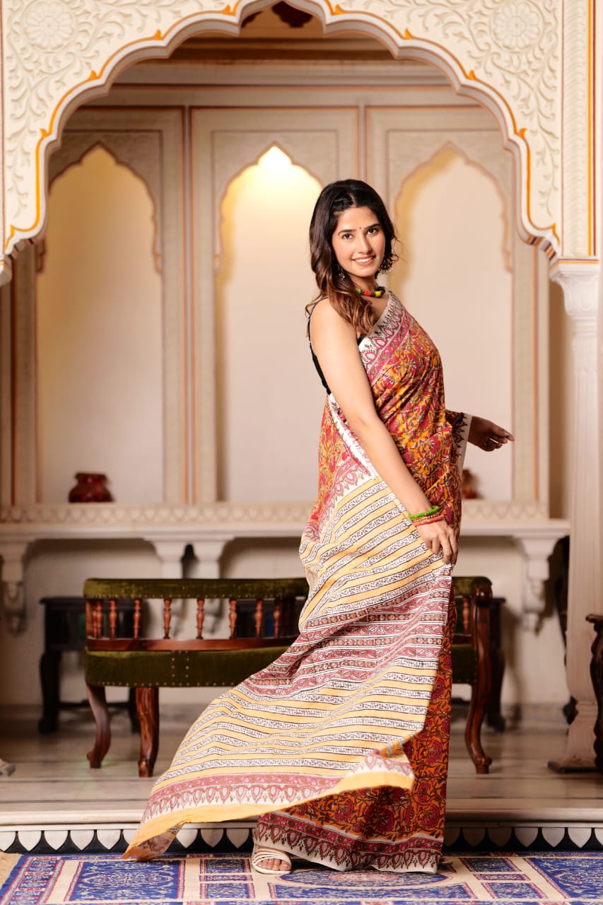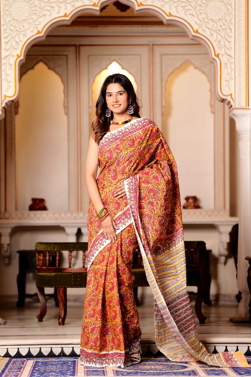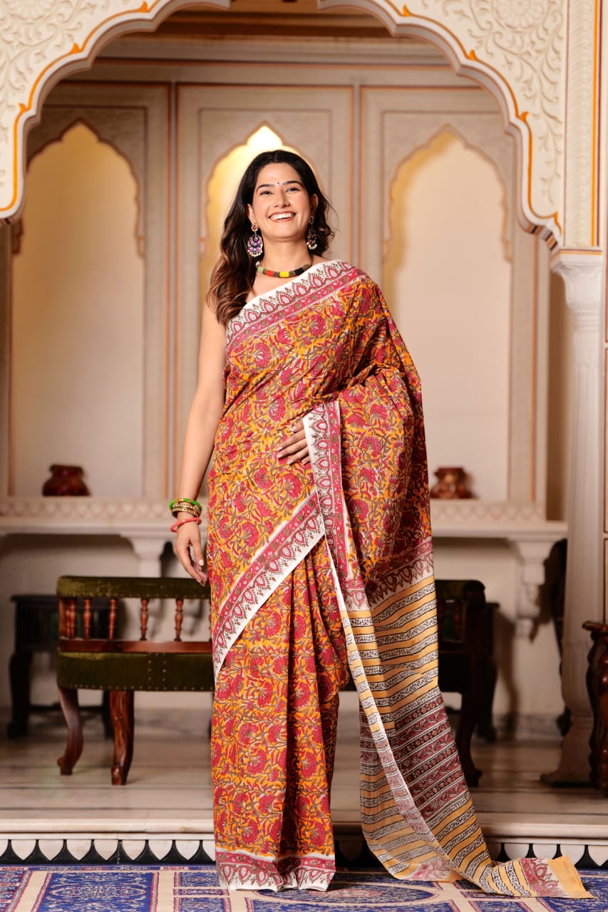 Traditional Authentic Hand Block Printed Pure Organic Cotton Sarees With matching Blouse.