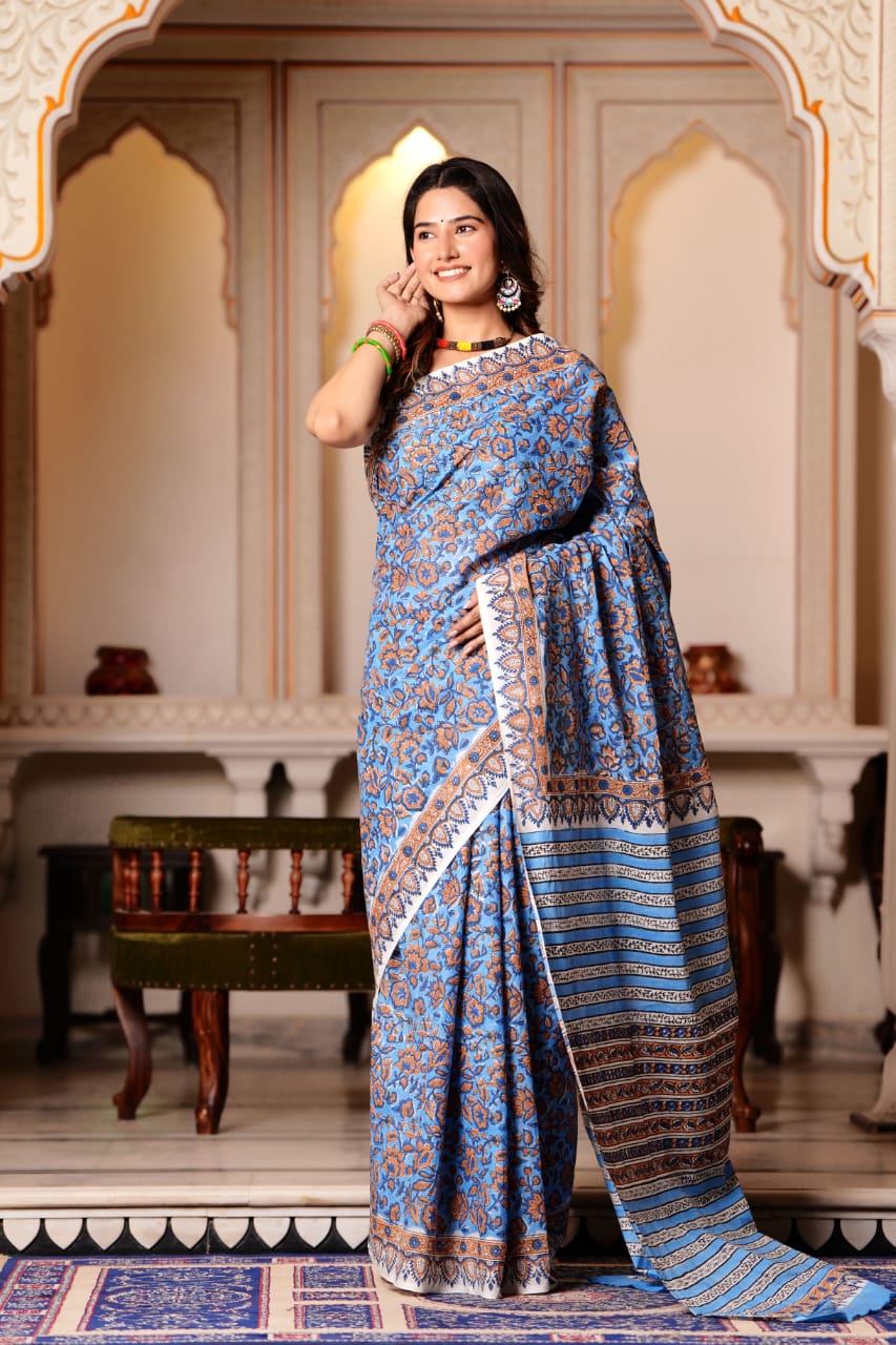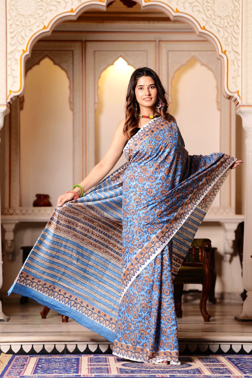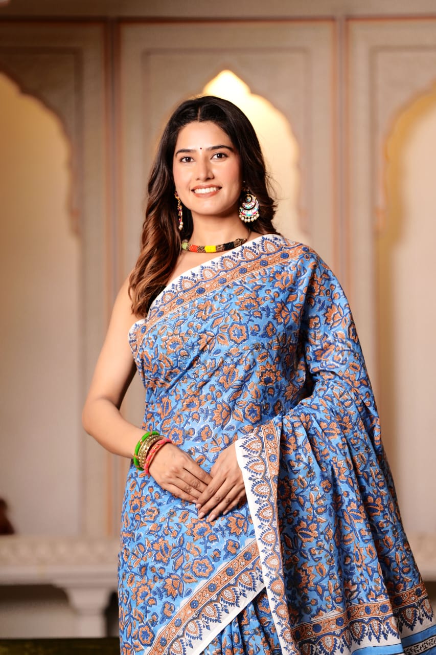 Traditional Authentic Hand Block Printed Pure Organic Cotton Sarees With matching Blouse.