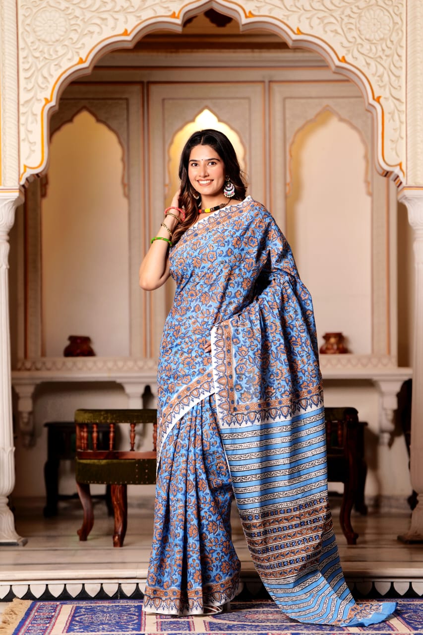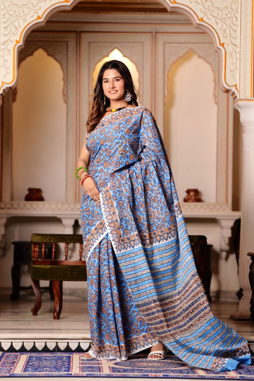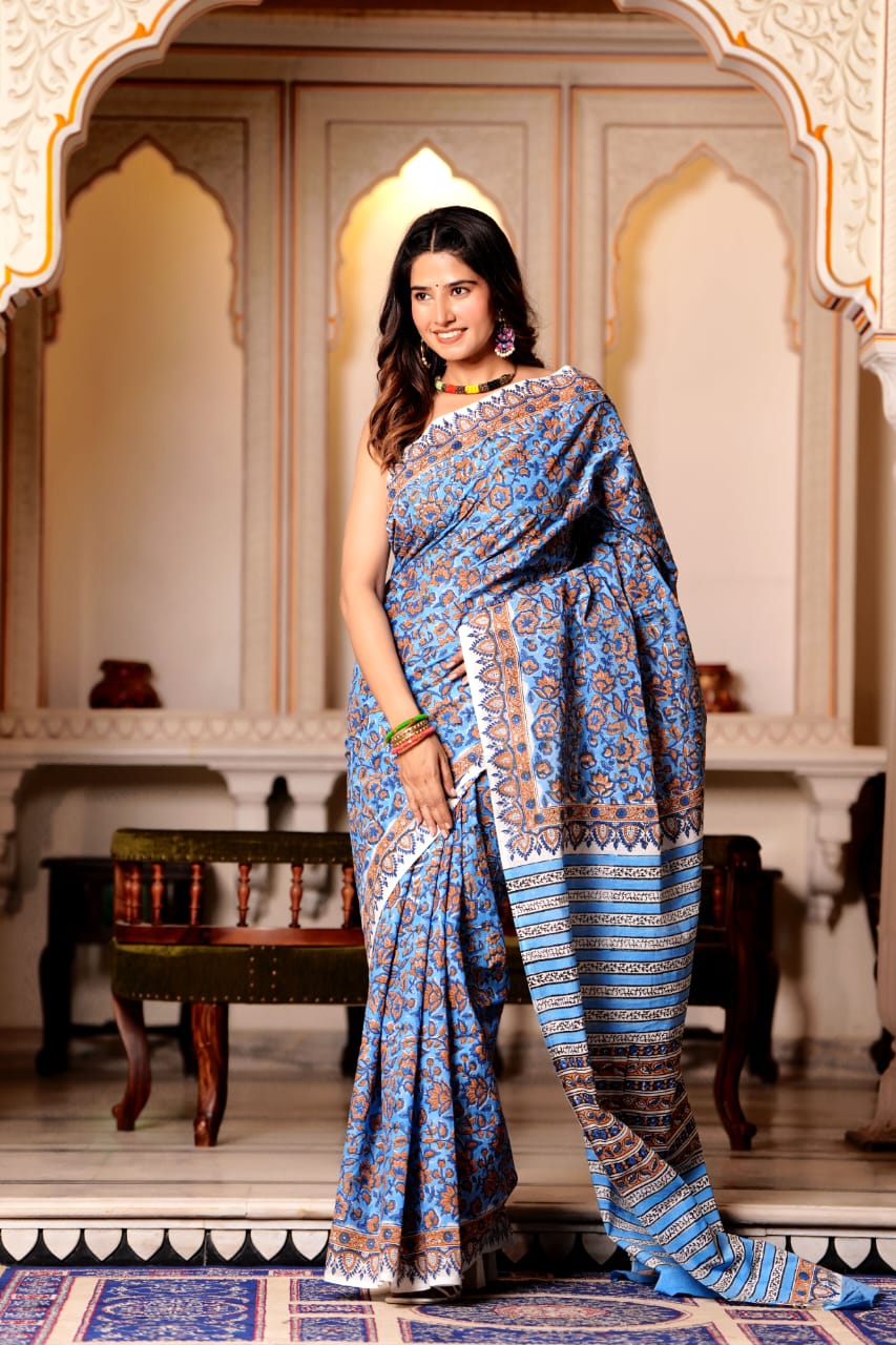 Traditional Authentic Hand Block Printed Pure Organic Cotton Sarees With matching Blouse.