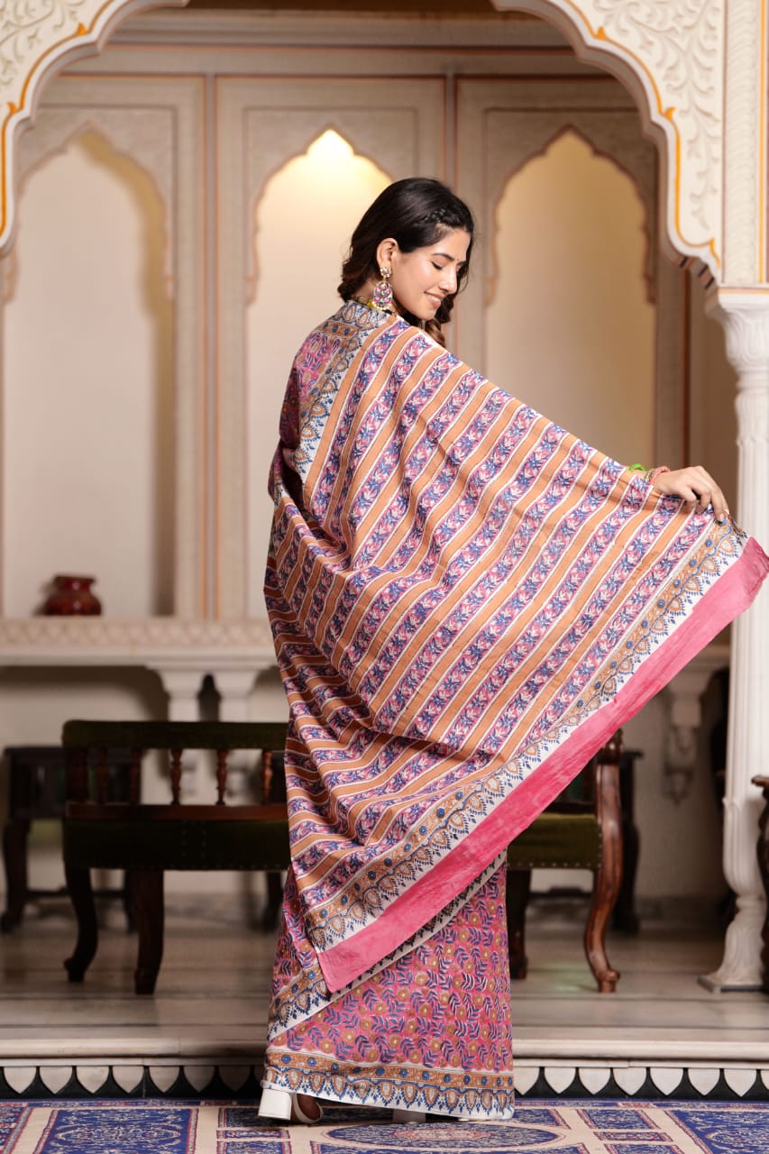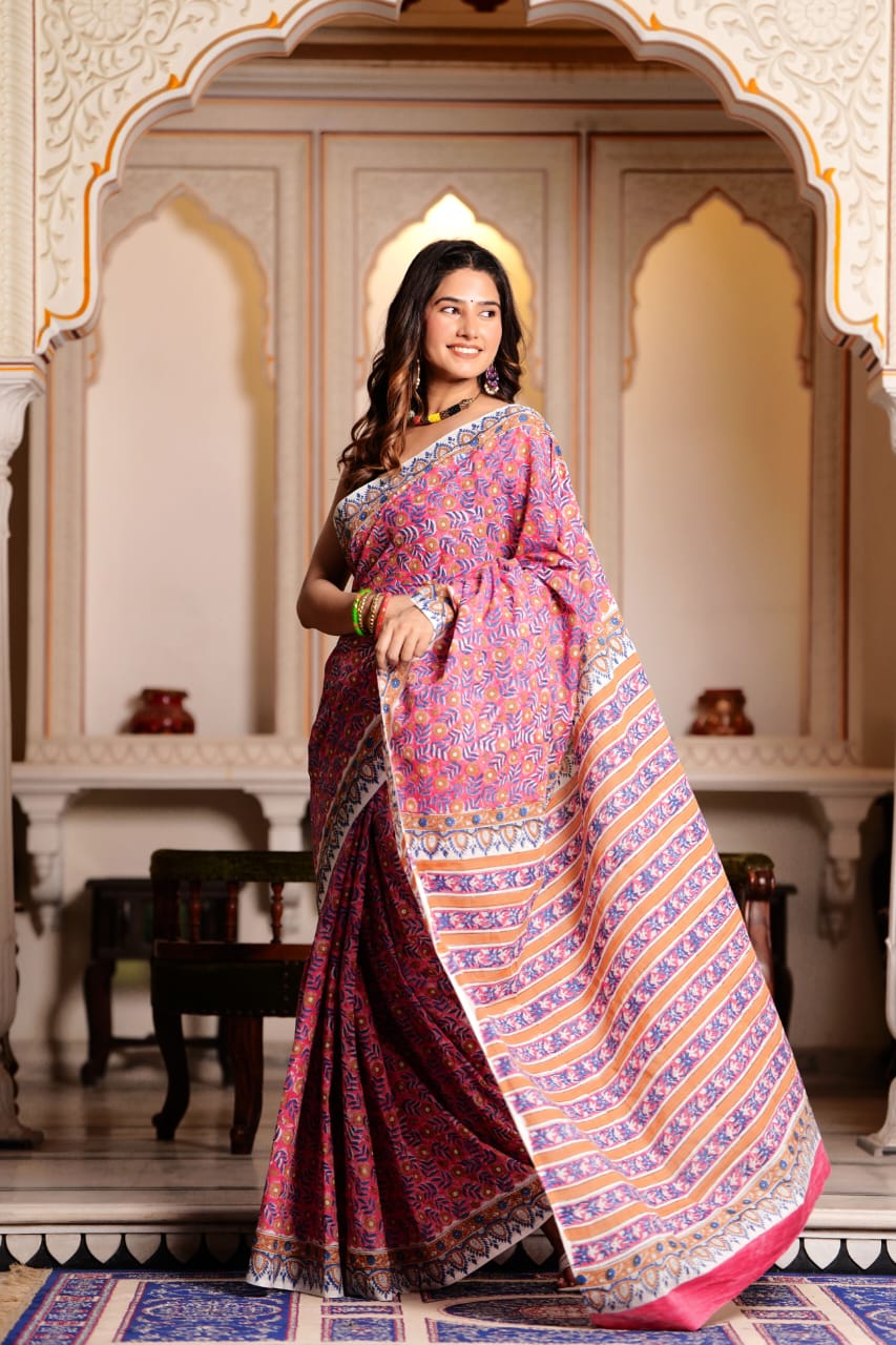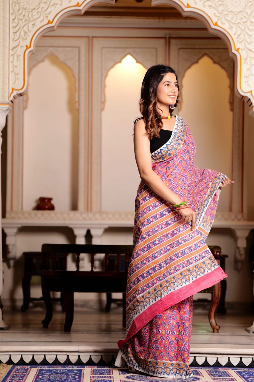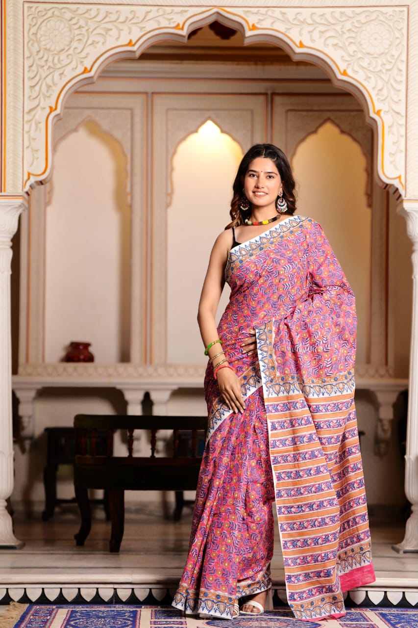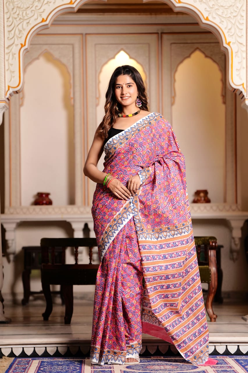 Traditional Authentic Hand Block Printed Pure Organic Cotton Sarees With matching Blouse.