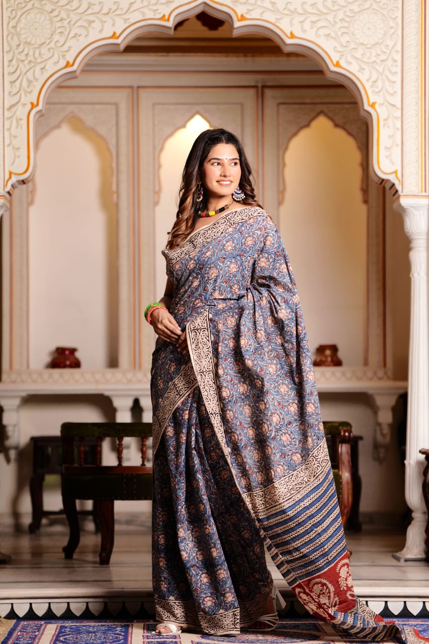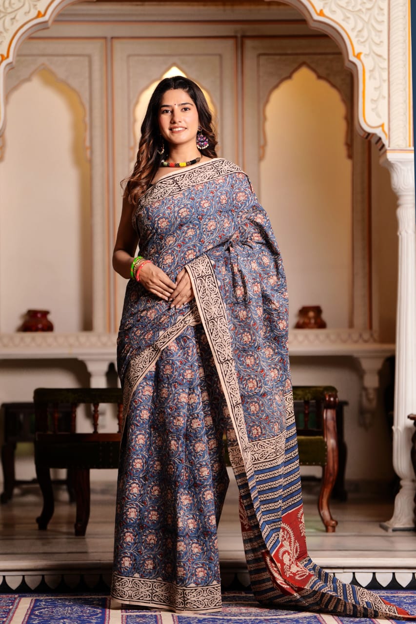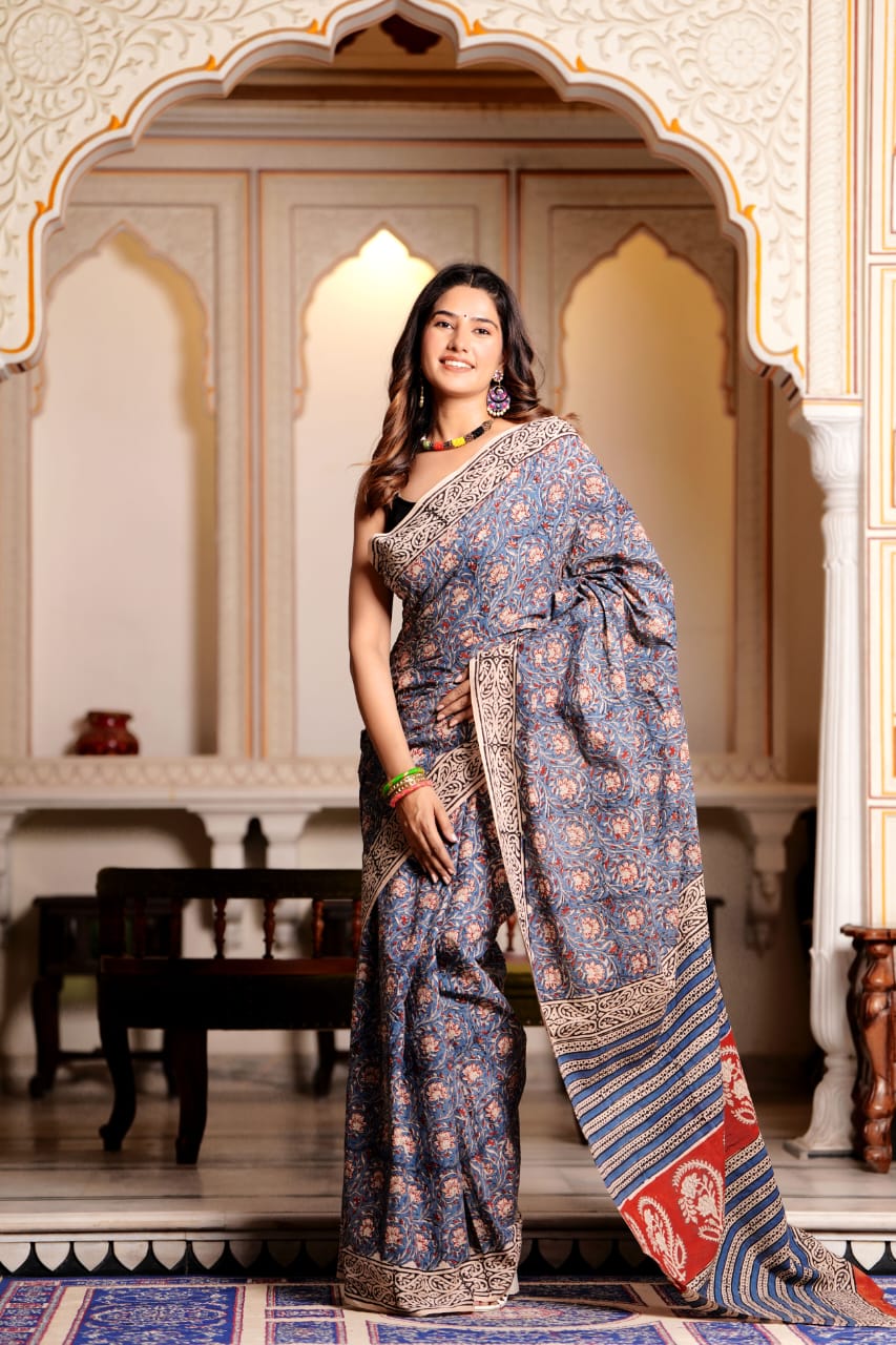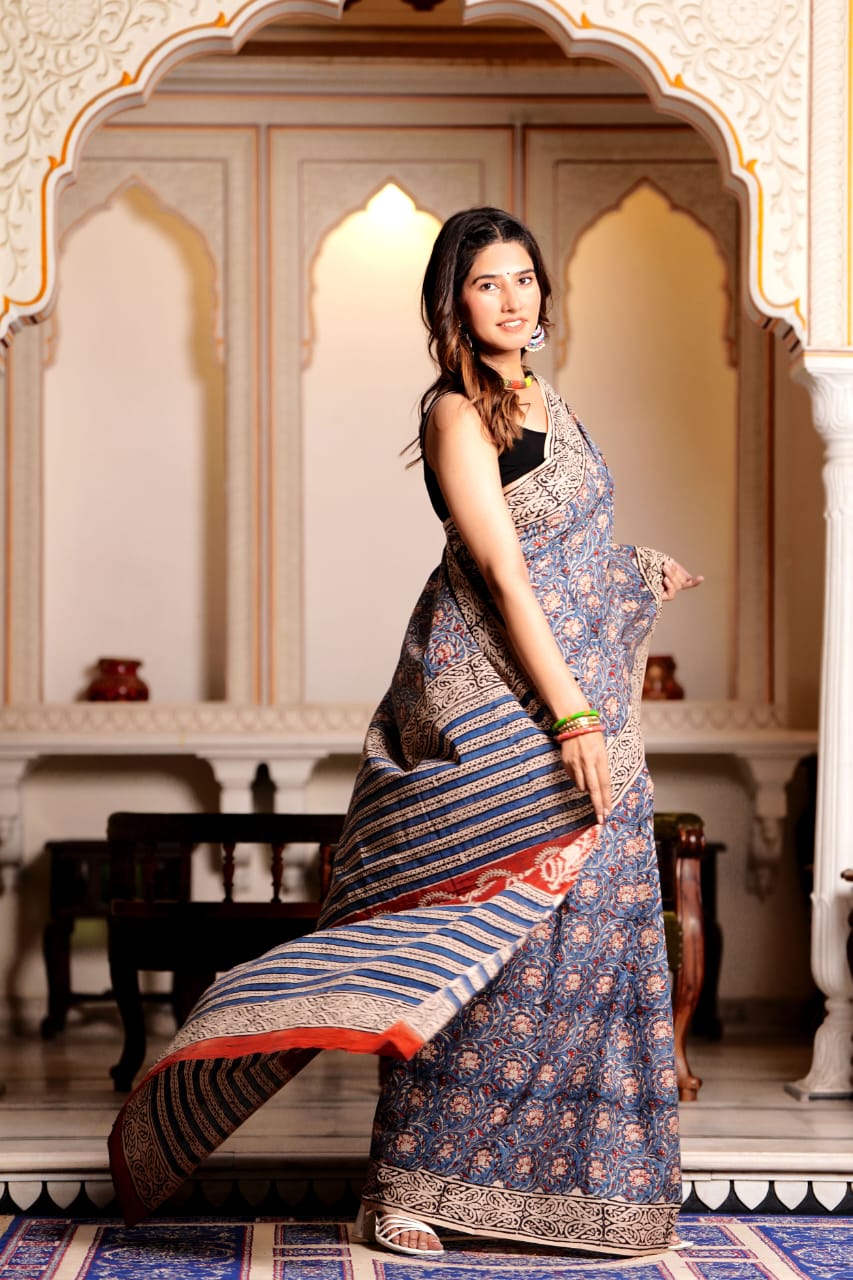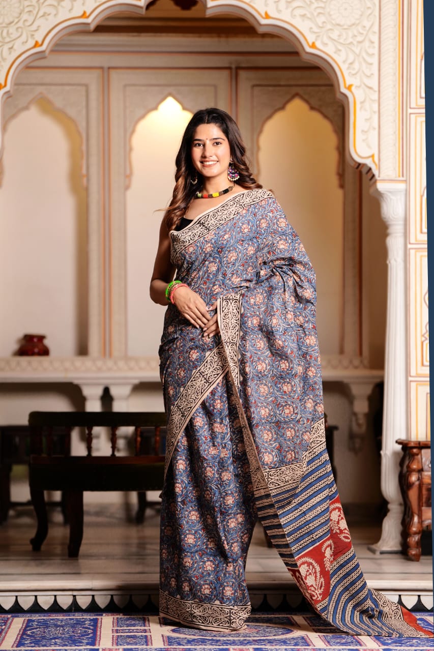 Traditional Authentic Hand Block Printed Pure Organic Cotton Sarees With matching Blouse.