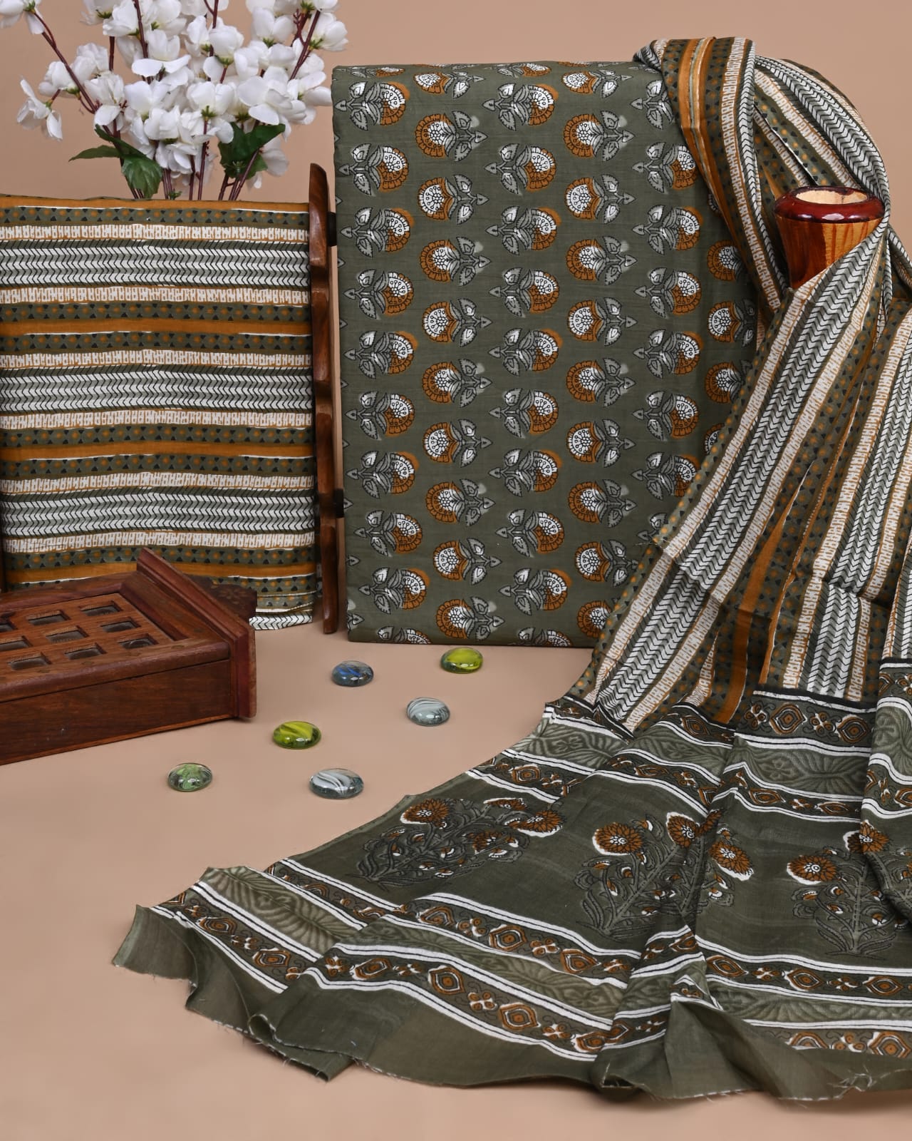 TRADITIONAL HAND BLOCK PRINT COTTON SUIT SET WITH MULMUL DUPATTA