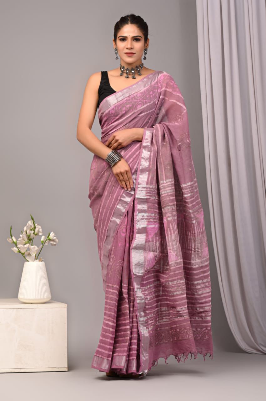 Hand Block Printed Linen Saree With Unstitched Blouse (SWSRLIL36)