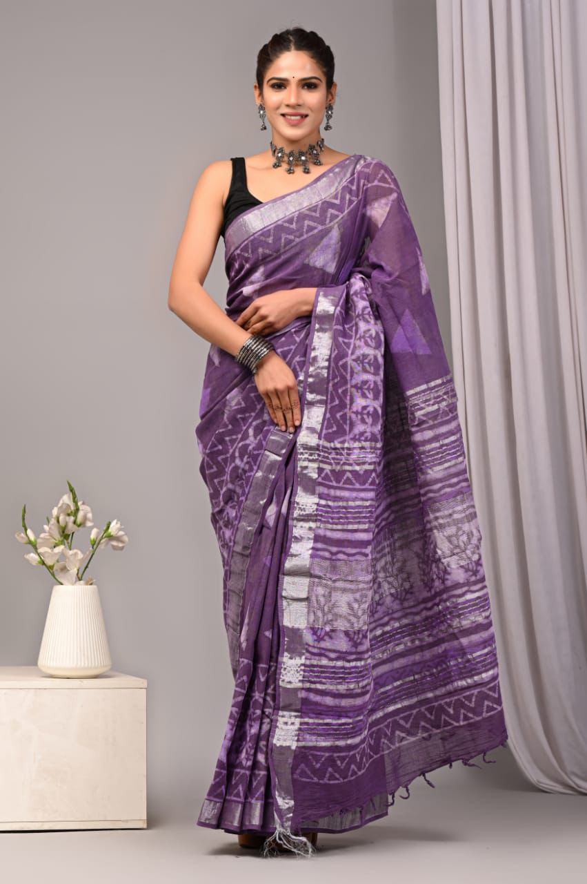 Handblock linen Printed Women's saree gives you great comfort, desired style and look and Fits most occassion and will make you Gaga over carrying a saree on every occassion.