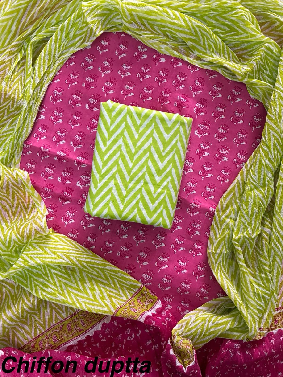 New Premium Hand Block Print Cotton Suit Set with Chiffon Dupatta(WACFCOTMU55)