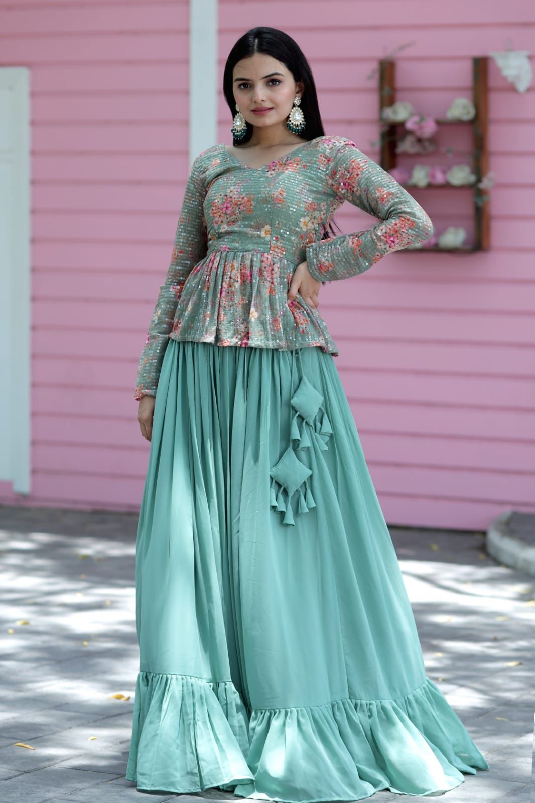Pista Green Faux Georgette Ruffle Lehenga With Sequence Embroidered Peplum Blouse