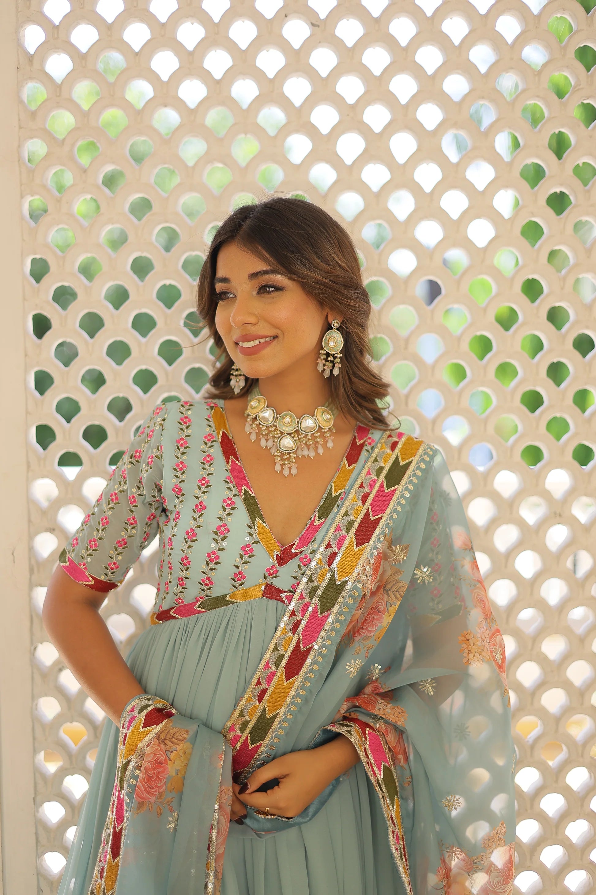 👉🏻FABRIC & WORK :- Faux Georgette With Embroidery Zari Sequins-work