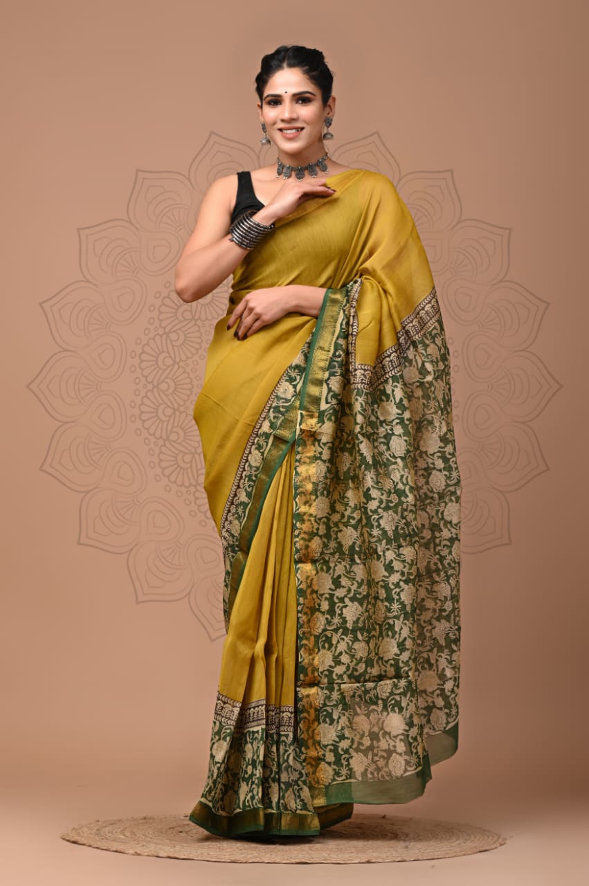 These sarees are purely handmade with hand block print techniques using vegetable dye, not using any harsh chemicals or acids. Minor inconsistency in print, lightness or darkness of print in some areas are natural in hand block print. These are not defect, but adds to individuality and uniqueness to the item.