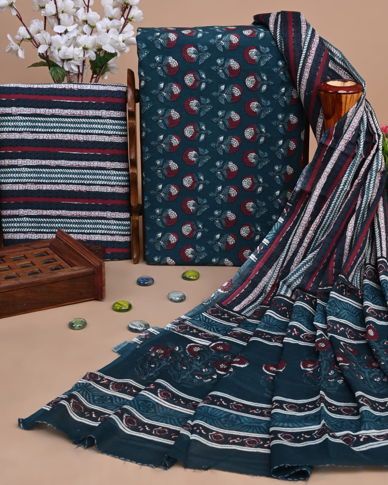 TRADITIONAL HAND BLOCK PRINT COTTON SUIT SET WITH MULMUL DUPATTA